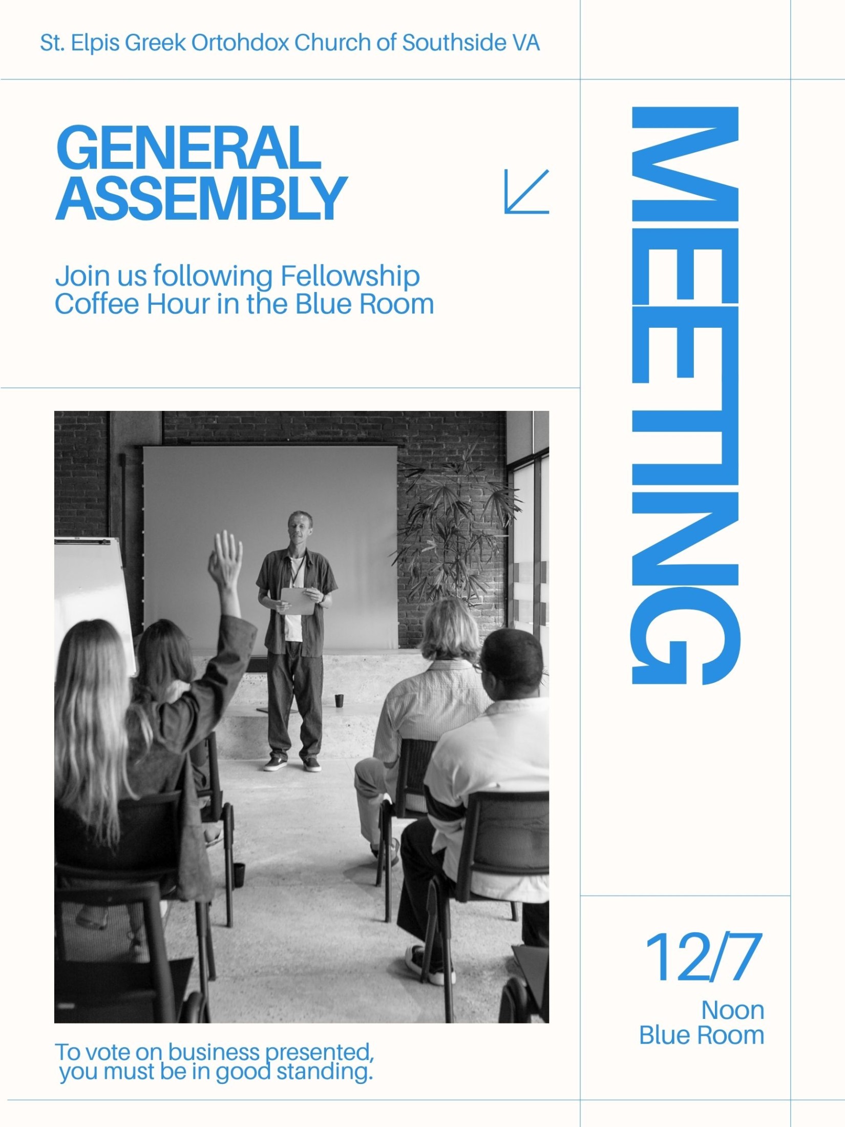 Regularly scheduled General Assembly meeting, following Fellowship Coffee hour. All parish members are welcome. To vote on business presented, you must be in good standing.